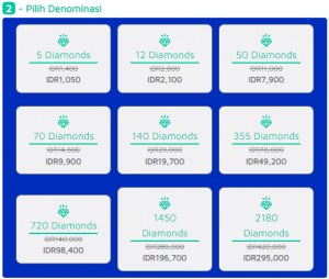 3. Pilih denominasi. Untuk harga bisa berubah-ubah. Namun saat menuliskan artikel ini, harga promo 5 diamonds FF lewat XL adalah Rp1.050. Sementara 12 diamonds FF yaitu Rp2.100. Silahkan pilih sesuai keinginan Sobat.