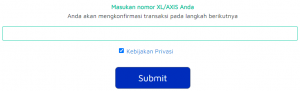 4. Masukkan nomor XL/Axis Sobat. Sobat akan mengonfirmasi transaksi pada langkah selanjutnya. Centang kebijakan privasi lalu klik submit.